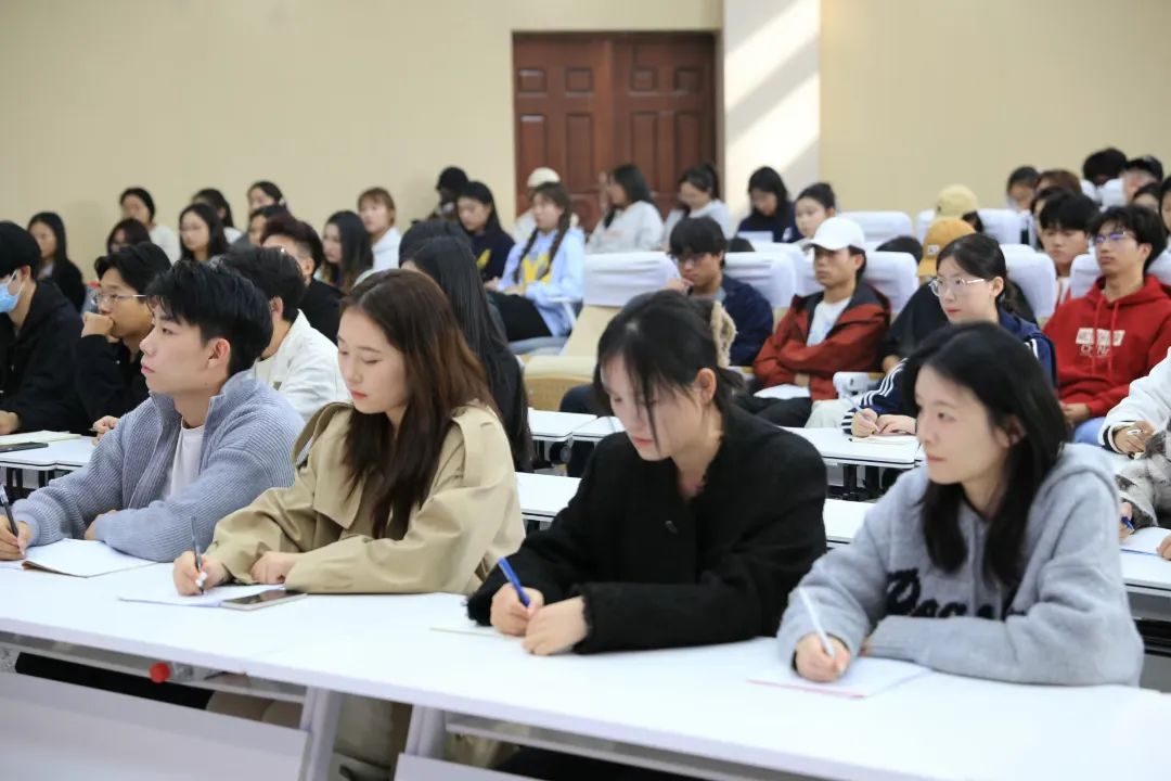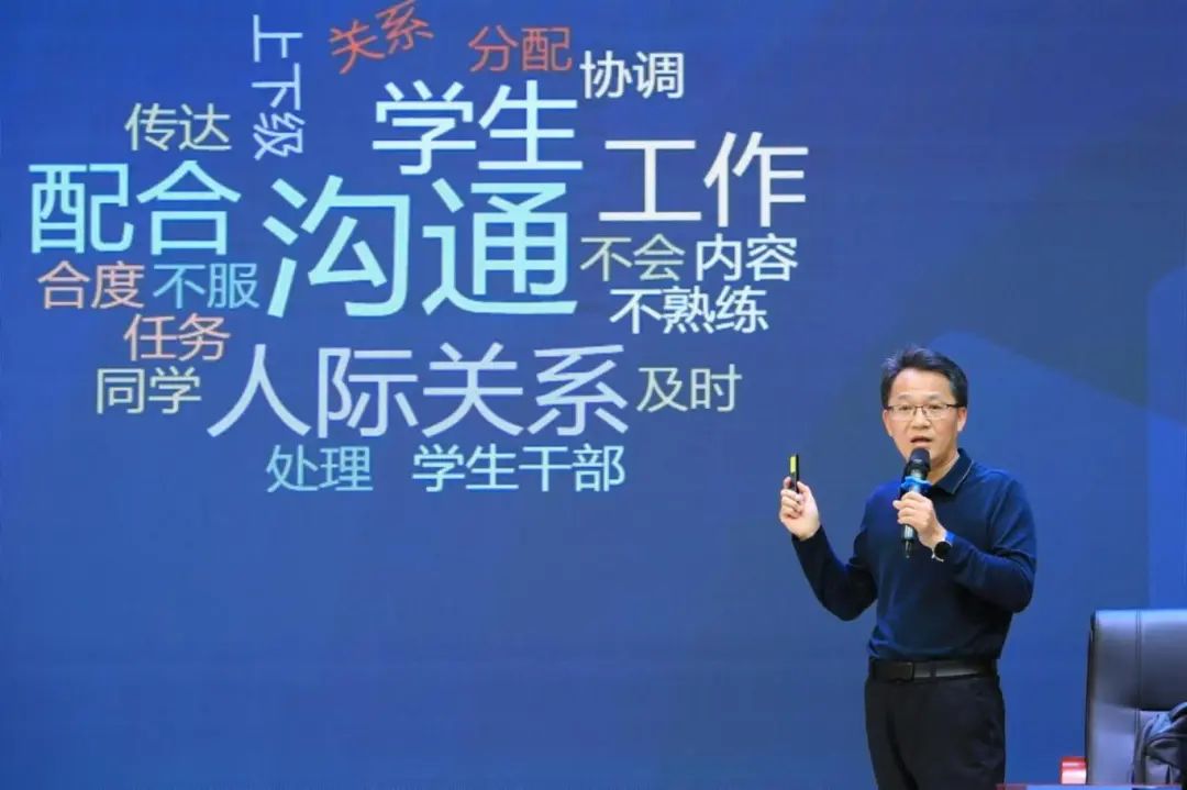 李贵杰以《个人与团队怎样掌握高效执行的艺术》为题,从学生、学生干部、学生心理健康素质三个方面展开讲述。他向现场师生提问“好学生是什么样子”,通过手机和“胡萝卜实验”的例子,引导同学们跨出迷茫,寻找方向。他引用身边优秀学生自主创业成功案例,鼓励同学们坚定方向,搜索目标,大胆试错。针对学生干部现存的普遍问题,他带领同学们逐一分析团队高效运行的关键点,与学生干部们深入探讨了作为学生干部应当具备的沟通能力、组织能力、纪律观念和集体意识。他强调了关注大学生心理健康的重要性以及学生干部在预防和干预学生心理问题中的重要作用,向在场师生分享了危机干预的成功案例,并详细阐述了学生干部在此过程中发挥的积极作用,希望学生干部关注同学们的心理健康状况,及时发现并介入潜在的心理风险。