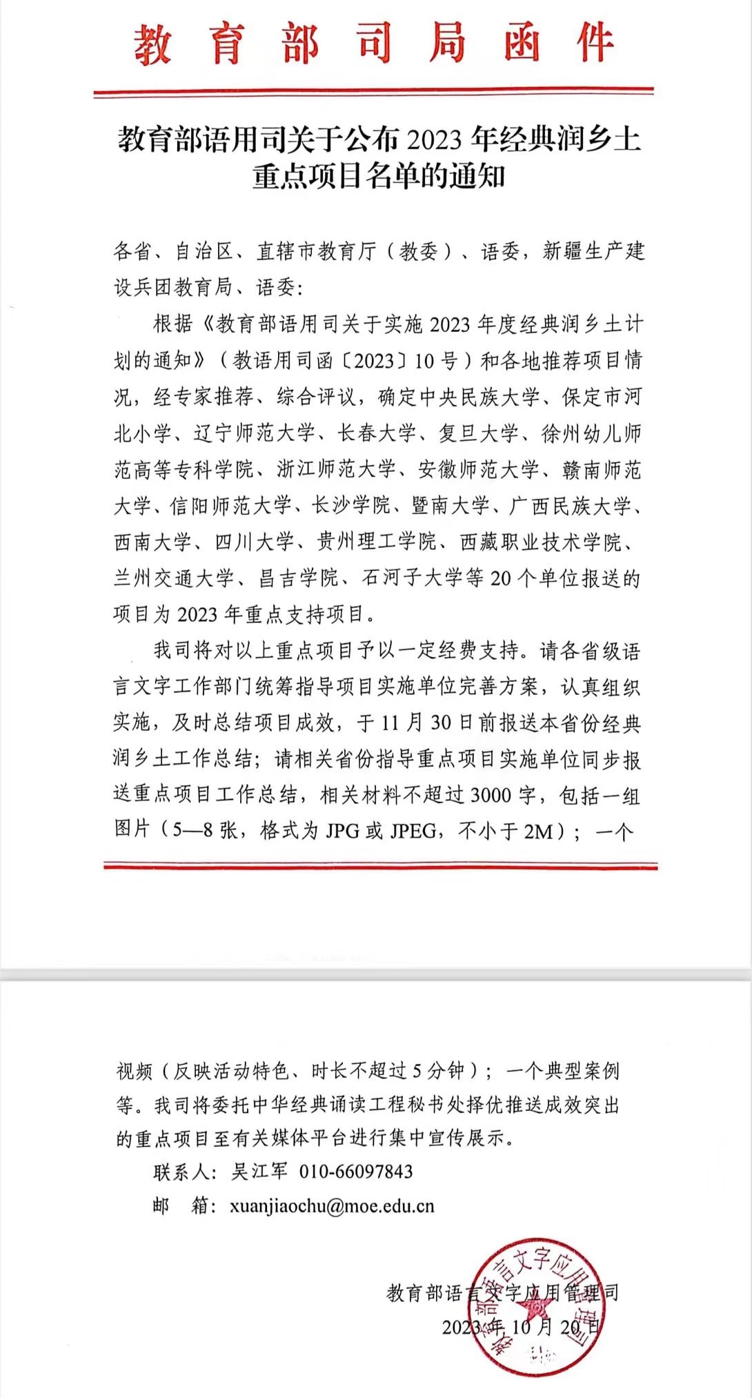 近日,教育部语用司发布了2023年“经典润乡土计划”重点项目推选结果的通知,信阳师范大学国家语言文字推广基地报送的《大别山革命老区乡村留守儿童语言文化专项服务项目》, 经专家评议、教育部评审,成功入选“经典润乡土计划”重点项目。这是我校基地获批以来连续三次获批该项目,是河南省唯一一个入选项目。