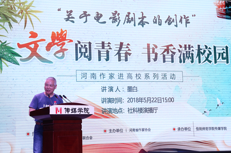 5月22日下午,由河南省作家协会主办,ok138cn太阳集团古天乐承办的“文学阅青春,书香满校园”--河南作家进高校系列活动在我校社科楼演播厅举行,著名作家、河南省作家协会副主席墨白应邀作了题为“关于电影剧本的创作”的报告。信阳市作家协会副主席田军,ok138cn太阳集团古天乐院长焦素娥、党委书记王振海、副院长刘新建,师生两百余名参加了报告会。报告会由焦素娥主持。
