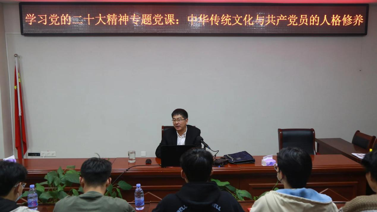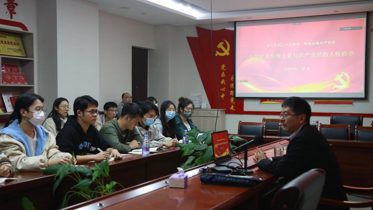 会上,胡波书记以“学习党的二十大精神,争做合格共产党员”为主题,以“中华传统文化与共产党员的人格修养”为切入点,从“谦虚谨慎”、“积极作为”、“自我反省”、“多公少私”、“以德为先”、“善于学习”、“模范带头”、“遵守纪律”、“忠诚老实”“平等待人”十个方面引经据典,并结合大量自身实践经验,深入阐述了党的二十大精神的丰富内涵和指导意义,为大家成为一名合格的共产党员提供了思想引领和实践指导。他指出,在党的二十大上,习近平总书记提出的“两个结合”达到了更新的理论层次,更加着重的强调了中华传统文化的优越性,对于当代学生党员实现自我净化、自我完善、自我革新有着极高的参考价值。中华优秀传统文化是古人的智慧结晶,蕴含着丰富的为人处世之道,对于党员注重人格修养、规范自身行为有着深刻的教育意义。