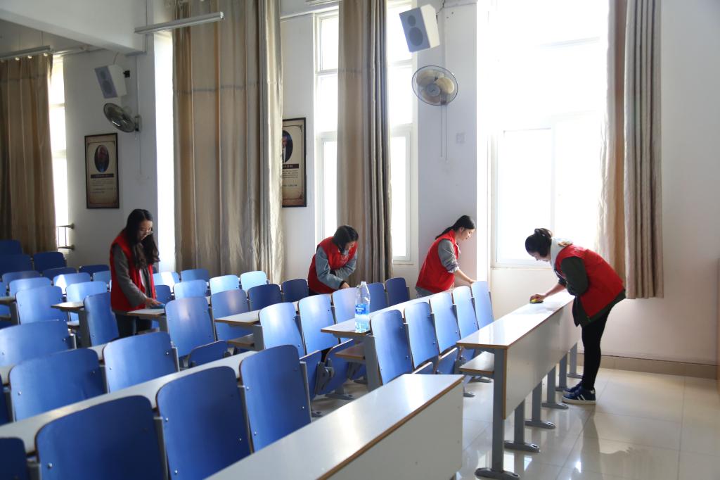 参加活动的成员统一着装,自带工具,以小组为单位对社科楼324、325、326、327四个教室进行清洁活动,美化学习环境。同学们分工明确,认真投入的清洗每一张课桌。在清理过程中,同学们对课桌上的字迹和污痕进行了集中清理,还对教室的卫生死角进行了清洁。同学们用实际行动做出表率,以呼吁大学生们爱护学校公物。