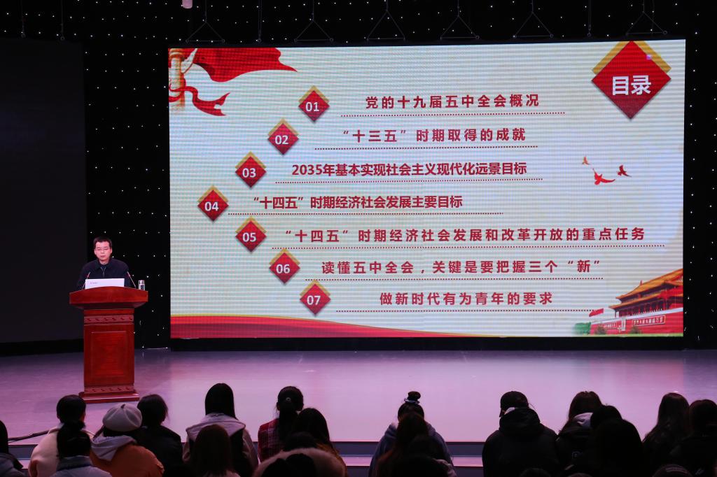 12月8日下午,ok138cn太阳集团古天乐党委书记王振海在社科楼演播厅以“学习十九届五中全会精神,争做新时代有为青年”为题宣讲党的十九届五中全会精神。全体新生辅导员和2020级新生聆听了讲座。讲座由尚弦老师主持。