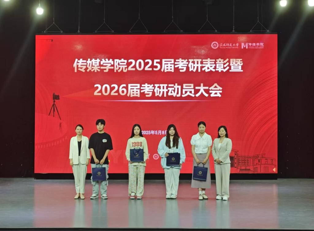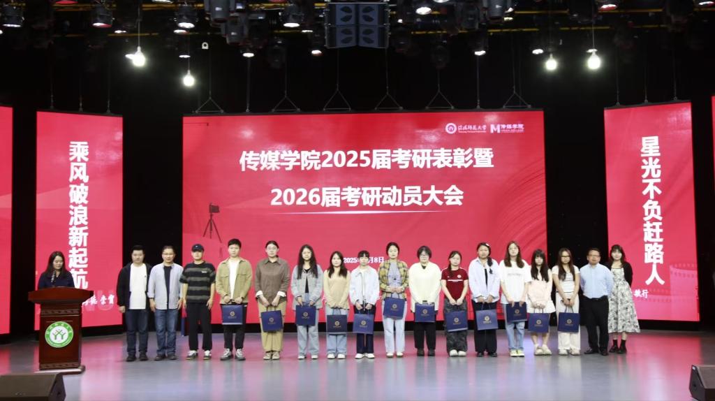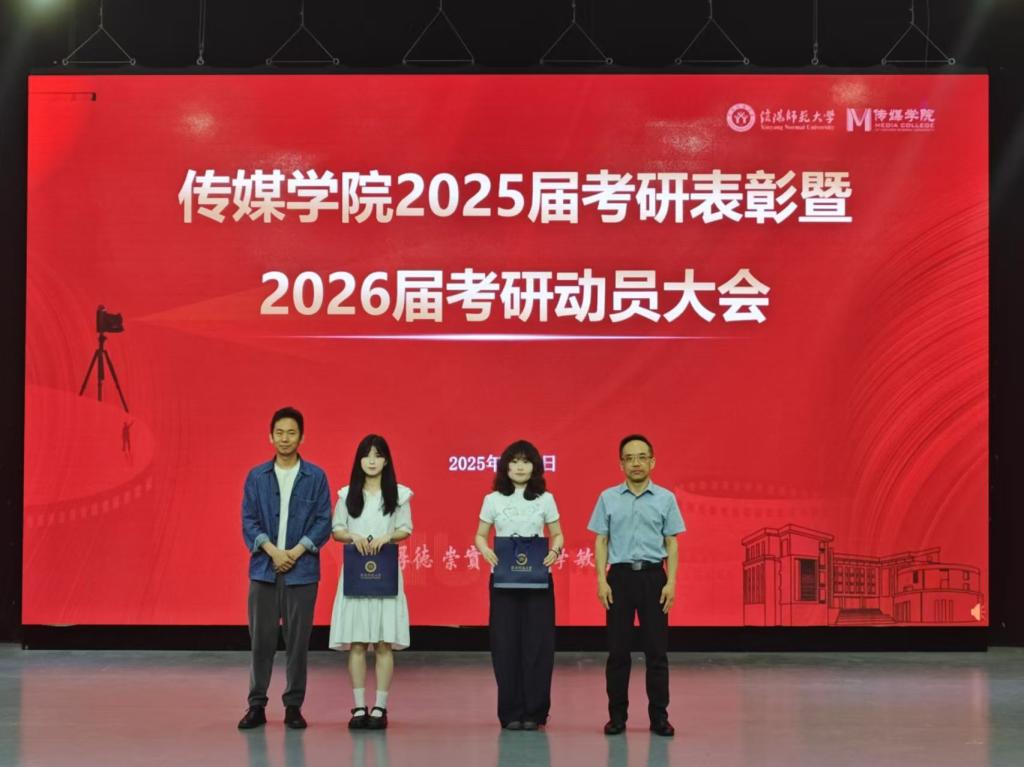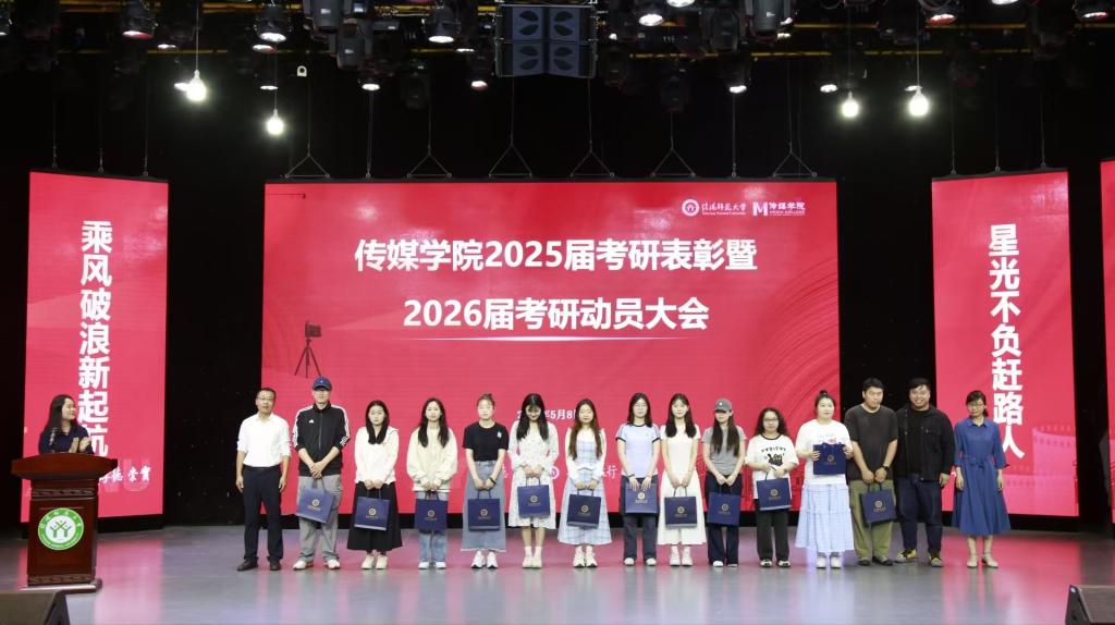 学院党委书记姚新春宣读2025届毕业生升学名单;学院领导老师为考取研究生学生颁发纪念品;各专业考研学生代表分享考研择校、学习安排、复试准备等方面的经验。