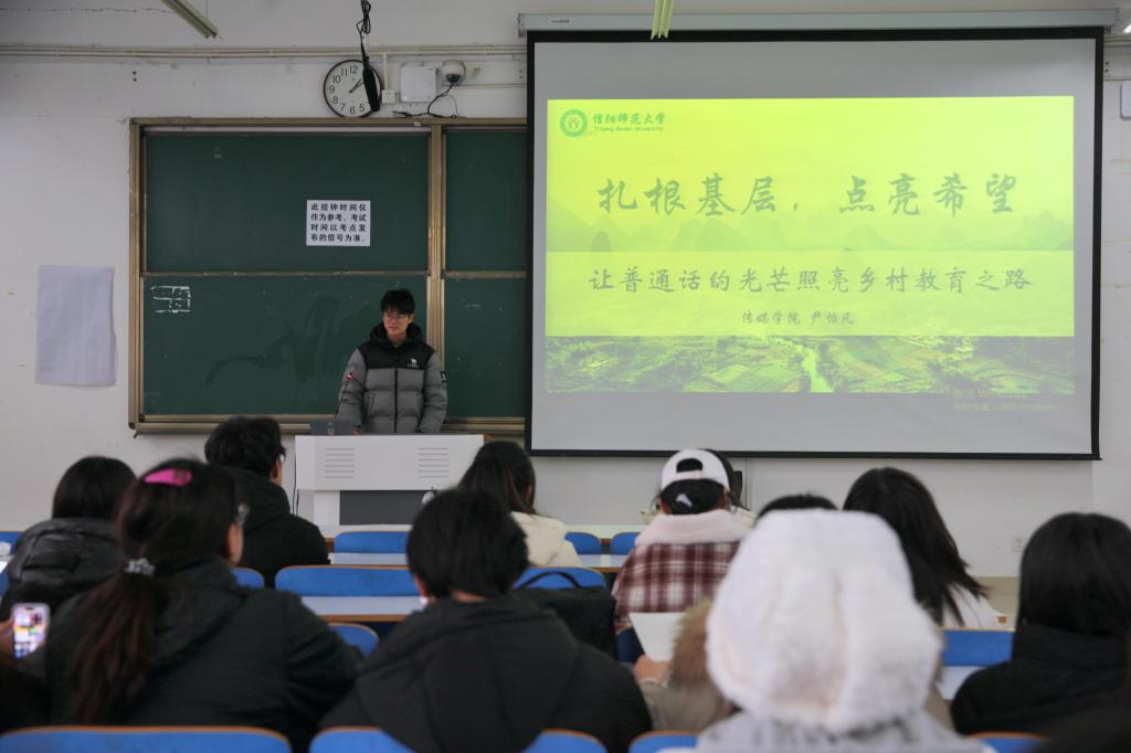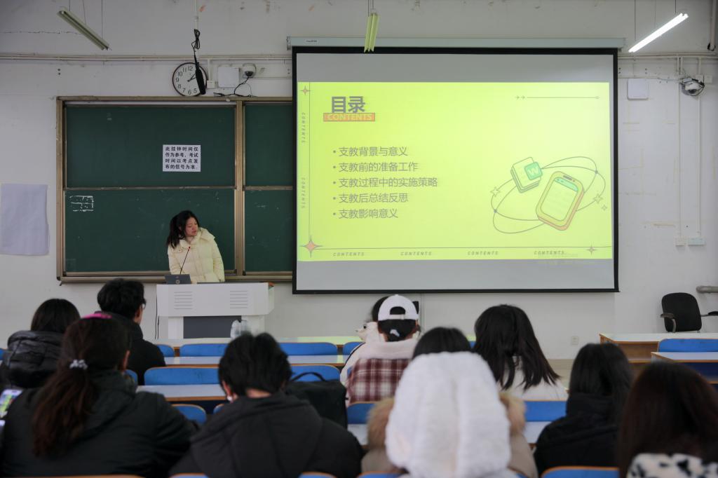 接着,23级播音与主持艺术专业张凌雪同学以“扎根基层教育,点燃希望之光”为主题,从支教的背景与意义、支教前的准备工作、支教过程中的实施策略、支教后的总结反思和支教影响意义六个方面进行阐述。她希望通过支教活动,提高当地学生的普通话水平,培养学生的学习兴趣,向学生们传递积极向上的价值观和正能量。她乐意将成功经验推广下去,扩大支教影响力,倡导更多大学生参与支教事业。