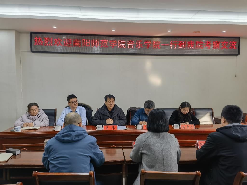 12月5日,南阳师范学院音乐学院院长季伟、副院长党岱、研究院院长刘振涛、研究生秘书张李子一行莅临我院调研交流。学院副院长田华、陈长旭,戏剧与影视文学系主任段金龙、专任教师王璐瑶参加座谈交流。