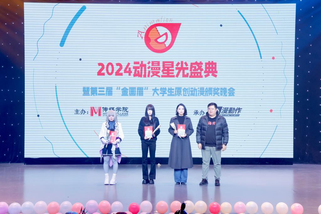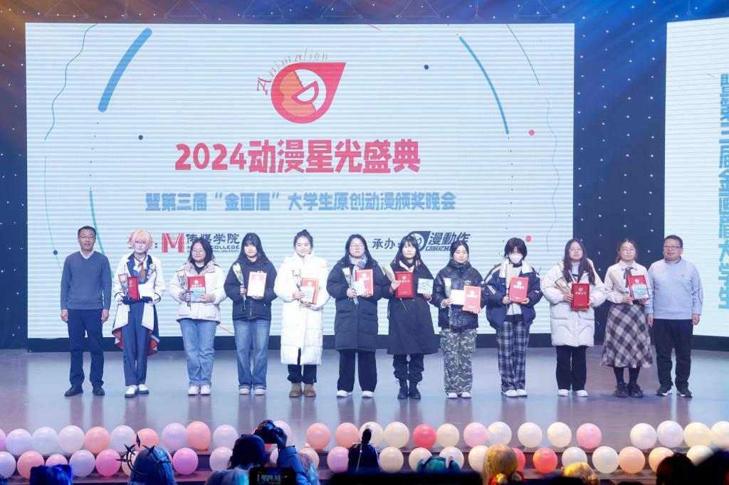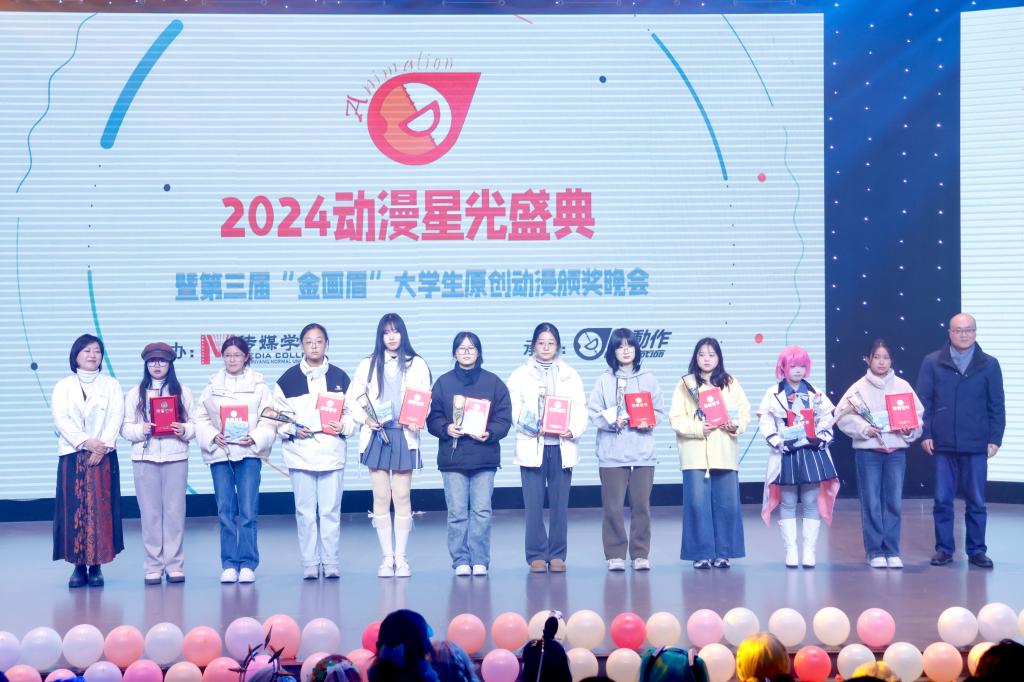 2024年12月10日晚,第三届“金画眉”大学生原创动漫大赛颁奖典礼在信阳师范大学社科楼演播厅举行。中国动画学会会长、国家广电总局宣传司原司长马黎,校党委副书记、工会主席岳宗德出席颁奖典礼并为获奖选手颁奖,河南省人文社科重点研究基地中原戏剧影视文化研究中心师生以及漫动作动漫社学生代表参加颁奖典礼。